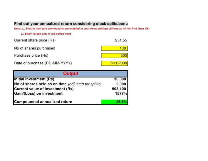See full list on investopedia.com If the stock has undergone any splits, make sure the purchase price is adjusted for splits. Further, it is one of the simplest forms of return assessment calculation, which is easily understandable. Look up the current price and your purchase price. Tenure of the investment made in months.